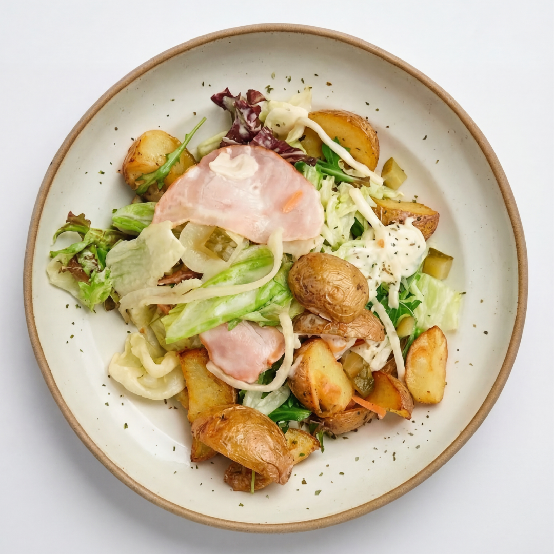 с печеным картофелем, корнишонами, квашеной капустой, и салатным миксом под чесночным соусом