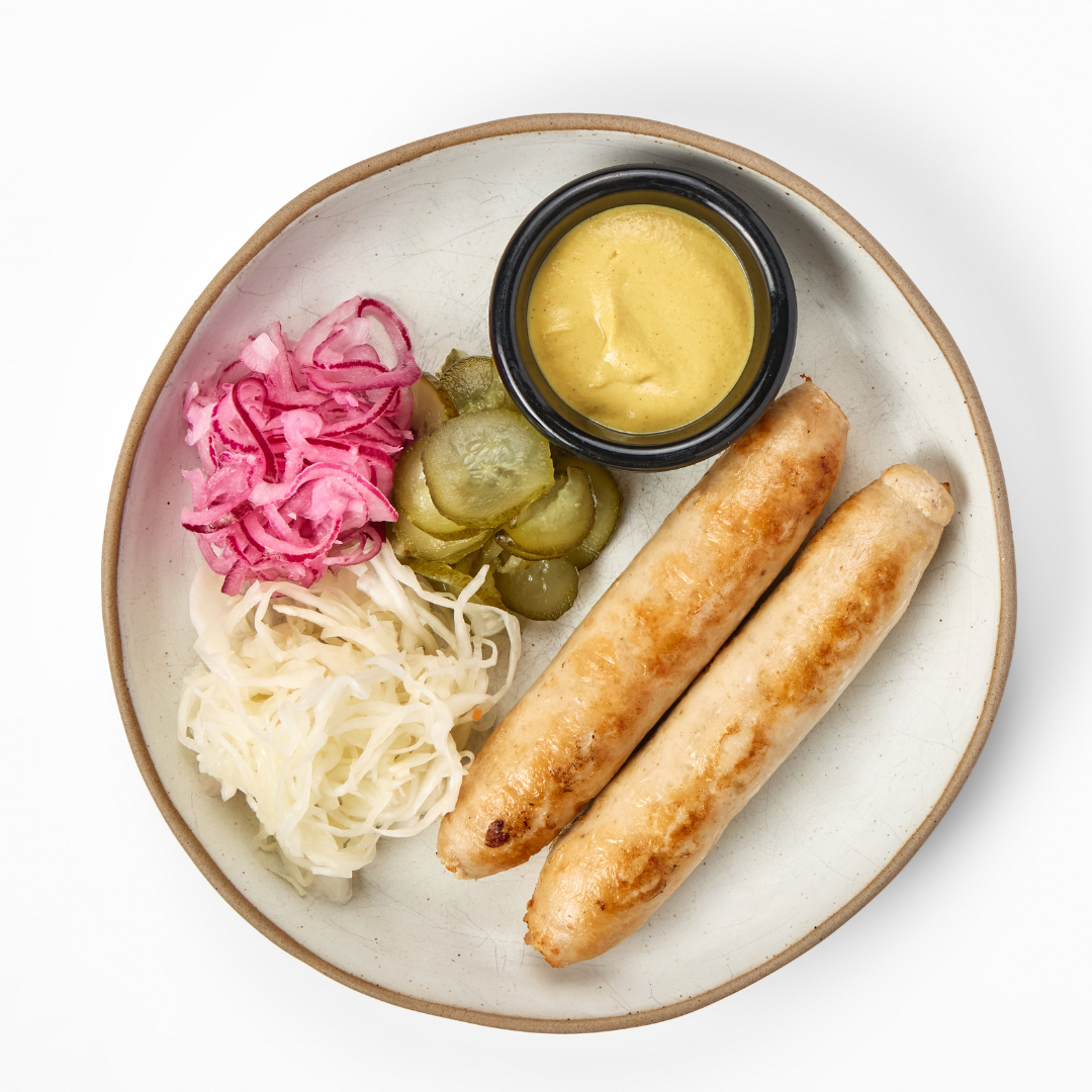 2 шт. на выбор: куриная, свинина/говядина. Подаются с квашеной капустой, маринованными огурчиками и луком, дижонской горчицей