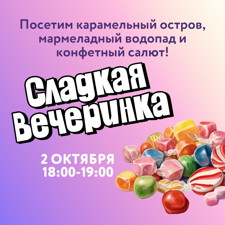 В пятницу 2 октября жду тебя в Мисти Парке! Посетим карамельный остров, посмотрим на мармеладный водопад, запустим конфетный салют и найдем сокровищницу СЛАДОСТЕЙ!